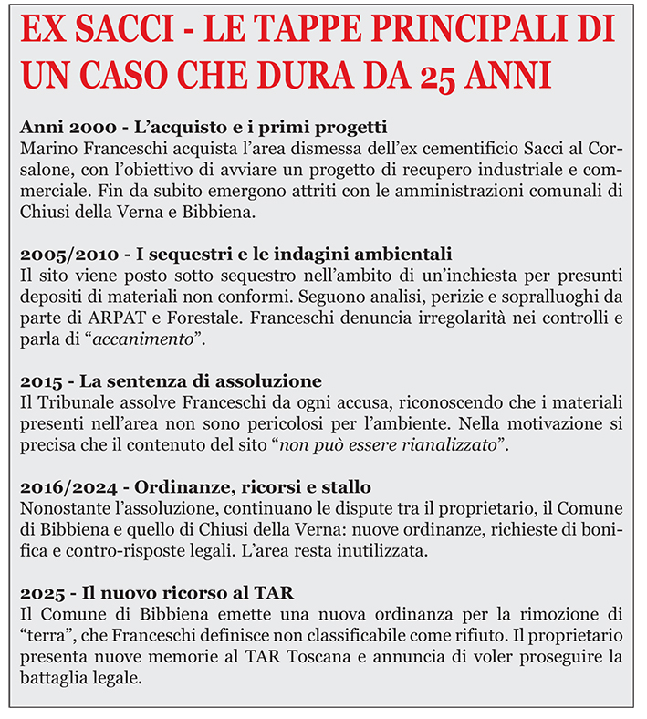 Dicevamo che sono passati più di 25 anni dall’inizio della travagliata vicenda legata all’area dell’ex Sacci; insieme a lei l’altro grande protagonista di questa storia è senza dubbio Marino Franceschi che da allora si batte per vedere riconosciuti i propri diritti su quel terreno. Negli anni Duemila, dopo l’acquisto dell’area dismessa, Marino aveva annunciato un piano di recupero e rilancio dell’ex cementificio, ma la vicenda si è presto trasformata in un intricato labirinto di procedimenti amministrativi e contenziosi con le amministrazioni comunali di Chiusi della Verna e Bibbiena, ARPAT, ASL, ecc. Diverse inchieste ambientali avevano portato al sequestro del sito, poi alla sentenza di assoluzione per lo stesso Franceschi, con la quale, ed è lo stesso Marino a ricordarcelo nel contributo scritto che ci ha inviato, il giudice aveva stabilito che “quanto presente nel sito non può essere rianalizzato e non è pericoloso per l’ambiente né per le persone”. Ma, nonostante questo la pace, per Marino e per la ex Sacci, non è mai arrivata. La storia continua tra nuove richieste di bonifica, ricorsi e ordinanze…