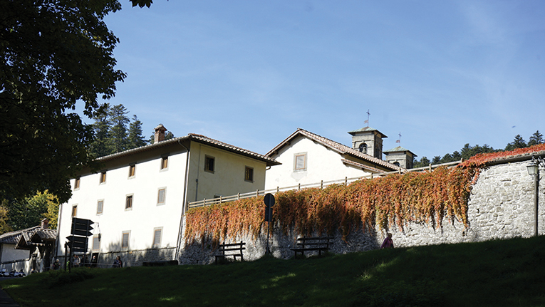 Proseguiamo verso l’eremo, passando da Prato alla Penna, evitiamo di percorrere il sentiero che taglia per la foresta preferendo utilizzare l’asfalto. Pochi chilometri in discesa e ci compare davanti l’Eremo di Camaldoli con il suo muro di recinzione ornato di rampicanti vestite dei colori autunnali. Una pausa per riprendere fiato e, se trovate il bar aperto, magari prendersi una bevanda calda.